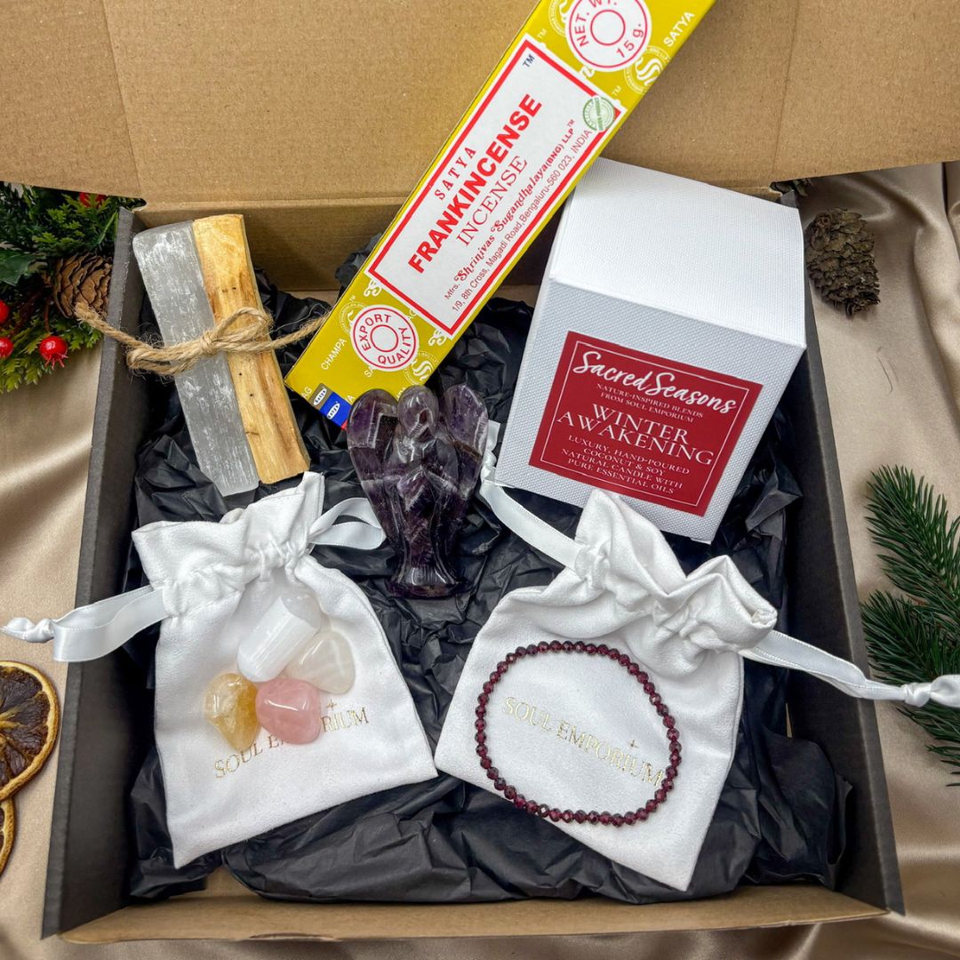 🕯️ How to use: To bring your Soul Emporium Winter Awakening Box together into a simple ritual, begin by lighting your Winter Awakening Candle and letting its warm, grounding scent fill your space. Burn a little Palo Santo or a stick of Frankincense incense to cleanse the energy around you, then hold your crystals one by one and set a quiet intention for the season ahead. You might place the Amethyst Angel on your altar as a symbol of guidance and protection, and wear your Garnet Bracelet as a daily reminder of your inner fire throughout the darker months.
